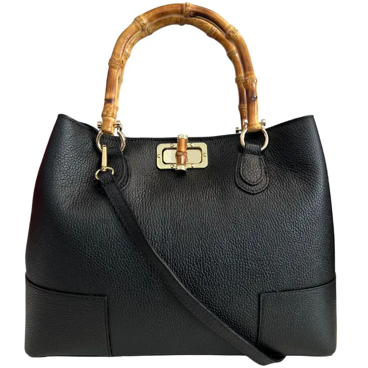 Genuine leather handbag with bamboo handles embellished with a metal and bamboo interlocking closure and handcrafted in Italy.